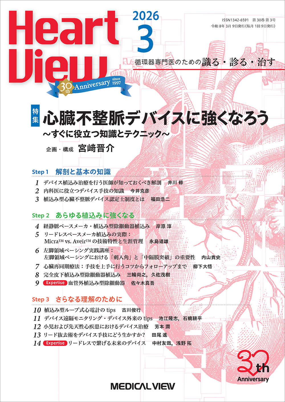 そこで本特集では,若手循環器内科医を主な対象とし,臨床現場ですぐに役立つ実践的かつ実用的な植込み型心臓デバイスの最新情報を提供することを目的としました。各分野のエキスパートの先生方にご執筆いただき,日常診療で直面する課題やその工夫について,丁寧に解説していただいています。素晴らしい原稿をご執筆いただいたすべての著者の先生方に心より感謝申し上げますとともに,本特集がデバイス植込み治療における適切な適応判断と安全な施行の一助となれば幸いです。